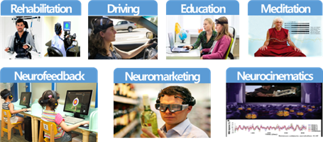 ■ 또한, 우울증, 조현병, 외상후스트레스장애(PTSD) 등의 정신질환 진단 및 관리에도 뇌파의 활용이 가능하며, 그 외에 뉴로마켓팅, 뉴로피드백, 뉴로시네마틱스, 엔터테인먼트 등 다양한 분야에서 일반인 대상으로도 뇌파의 응용 및 활용이 가능하다.